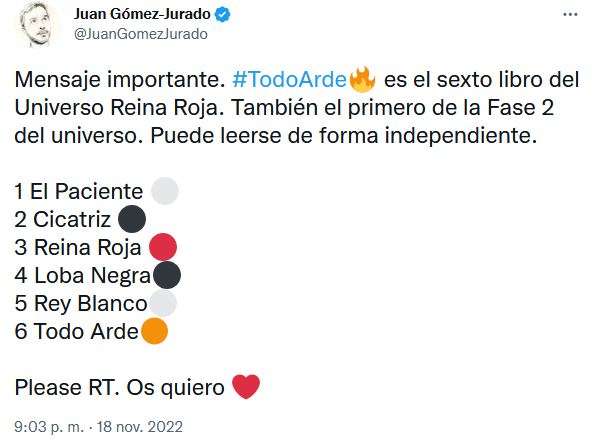 En este hilo de Twitter, el autor explica que unos libros están relacionados con otros y que los protagonistas de Reina Roja, Jon y Antonia, volverán de la mano de las protagonistas de su última novela Todo arde. Por tanto, el autor está preparando el terreno para la creación de un macrouniverso formado por diferente libros, sagas y protagonistas, que se podrá disfrutar tanto de manera independiente como en su conjunto.