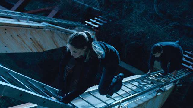Comienza la iniciación, Eric comenta que los iniciados que no superen el corte se irán y ahora sí que se empieza a mostrar la dureza de la facción. El entrenamiento está bastante bien, aunque echo de menos algo más de dinamismo y algo de profundización en los personajes secundarios, pues aunque conocemos bien a Christina no puedo decir lo mismo de Will, Al o Peter, y no digamos ya de Molly o Drew, que ni sé si llegan a aparecer en algún momento. Esto es de lo poco que puedo echar en cara a la adaptación, pues si no llegamos a conocer lo suficiente a Al y a Will sus muertes no nos pueden afectar de igual manera. Lo mismo pasa con Peter, que aunque molesta a Tris en alguna ocasión no llega a ser tan cruel como en el libro, lo que hace que su personaje pierda bastante. También me hubiera gustado ver a Tris un poco más machacada tras la paliza de Peter, aunque me gusta que después decida ir a la toma de la bandera, cosa que no ocurre igual en el libro, demostrando así su valentía y tesón (como también hace en las escenas en las que está entrenando sola).
