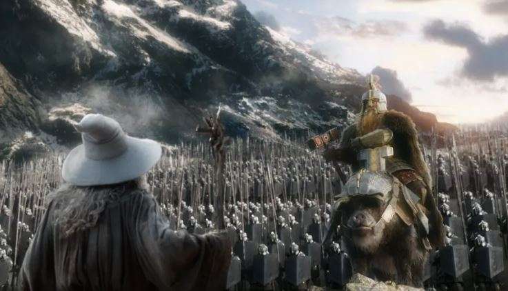 Así, Thorin, viéndose rodeado, pide ayuda a su primo Dain, que acude en su rescate con un cuarto ejército compuesto por enanos. Pero, justo cuando va a enfrentarse a los hombres y elfos, aparece un quinto ejército de orcos, enemigo común de los demás, lo que provoca que los que eran hasta ahora enemigos se alíen entre sí. Un momento muy épico coronado además por la participación final en la batalla de Beorn y de las águilas.