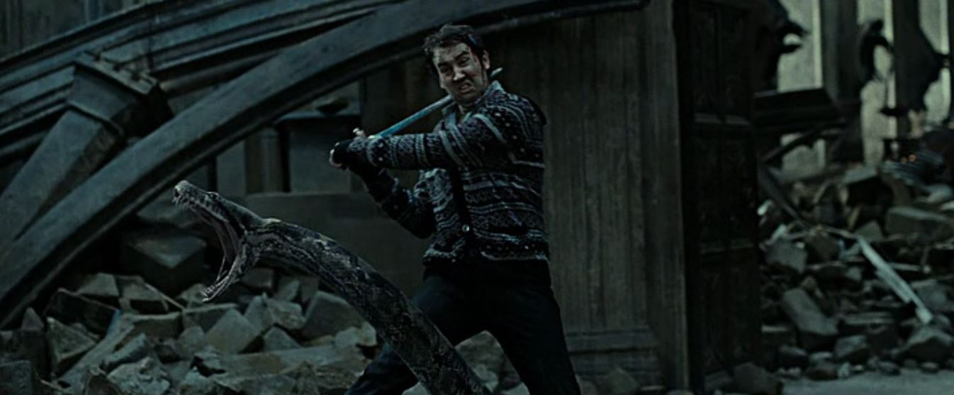Pasamos entonces a la parte en la que Harry se hace el muerto, y aquí es donde le pierdo todo el respeto a Voldemort con esa risa que le ponen en el doblaje en castellano. El discurso de Neville es de lo más épico, desembocando de nuevo en ambiente de guerra. Harry salta de los brazos de Hagrid y se reanuda la batalla, pero en esta ocasión creo que se alarga demasiado, y desearía que esta parte sí hubiera sucedido tal y como se narra en el libro, aunque la escena de Ron y Hermione intentando matar a Nagini está bien, así como Neville acabando con ella con la espada de Gryffindor, con la que dan ganas de levantarse y aplaudir (¡bravo, Neville!), y también Molly venciendo a Bellatrix y cómo huyen los Malfoy.
