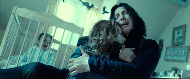 Pero vamos al gran momento de la peli, los recuerdos de Snape. La escena en su conjunto es casi perfecta. Ahí tenemos a Snape y Lily de niños, y también a Petunia. Precioso cómo se muestra la amistad entre ellos, cómo iban juntos en Hogwarts, aunque me habría encantado ver también cómo se distanciaron. Falta la escena en la que Lily quiere defender a Snape y éste la llama sangre sucia, así como su posterior arrepentimiento y sus disculpas, que Lily no acepta. Y ya que estamos, podrían haber puesto a una niña que al menos tuviera los ojos azules como los de Daniel Radcliffe. Pero por lo demás, es sublime. Los flashbacks de la primera película me emocionan, incluyendo la primera vez que Snape mira a Harry a los ojos, así como todas las conversaciones con Dumbledore, demostrando que Snape siempre le fue fiel, o el momento en el que entra en la casa de los Potter después de que Voldemort los matara y cómo solloza con el cadáver de Lily en brazos. Desgarrador.