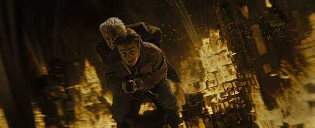 La escena en la Sala de Menesteres y la pelea entre Harry, Ron y Hermione y Draco, Crabbe y Goyle es fabulosa. Se sigue representando cómo la situación supera a Draco, ya no es el fanfarrón de antes, tiene miedo. Genial cómo se incendia la sala, cómo los salvan montados en las escobas voladoras, destruyen el Horrocrux y se cierran las puertas de la Sala.