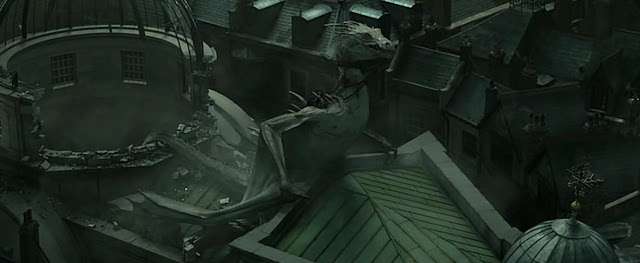 Me encanta que no se haya cambiado nada del escenario de Gringotts de la primera peli, pues refuerza la nostalgia que sentimos todos, y que nos hayan mostrado el vertiginoso paseo en los carros para llegar a las cámaras, que no se terminaba de mostrar del todo bien en “La Piedra Filosofal”. Por otra parte, y ante la escasez de explicaciones por parte de la sexta película, “El Misterio del Príncipe”, aquí se han tenido que inventar una explicación de cómo Harry sabe qué objeto es el Horrocrux. Según la peli, Harry, de alguna manera, siente a los demás Horrocruxes (pues como sabemos más tarde él mismo es uno de ellos), por eso sabe que en la cámara de los Lestrange es la Copa de Hufflepuff, al igual que pasará más adelante para encontrar la diadema de Ravenclaw en la Sala de los Menesteres. Y la verdad es que la explicación tiene su lógica aunque no aparezca nada de esto en el libro, y me parece convincente para no dejar esas lagunas en la película. Por otra parte, la idea de escapar a lomos del dragón en el libro es de Harry, mientras que en la peli es de Hermione, y me hubiera gustado que hubiera sido de Harry también aquí para mostrar esa determinación final e inflexible del protagonista. A pesar de todo, grandísima escena.