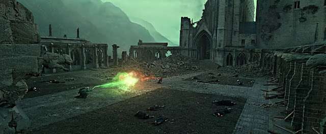 Sin embargo, la lucha personal entre Harry y Voldemort se alarga de más. Primero pelean en los pasillos de Hogwarts, donde Voldemort por lo visto se olvida por un momento de que es mago y se pone a pegarle tortas y guantazos a Harry (ridículo), luego acaban en lo alto de una torre en la que Harry le echa los brazos al cuello a Voldemort (¿?) y ambos caen, para acabar en la entrada del colegio arrastrándose en busca de sus varitas. Ay ay, no, no mola nada. Esta parte es horrible. Si por mí fuera, quitaría toda esta parte de la película y habría empleado ese tiempo en alargar las escenas de la parte inicial de la batalla, en incluir a los centauros en la lucha, disparando flechas a los mortífagos y en la conversación de Harry y Dumbledore. Me habría encantado ver también a los elfos domésticos de las cocinas luchando con cuchillos y sartenes, dirigidos por Kreacher, aunque entiendo que esto no es posible pues nunca en las pelis han aparecido los elfos que trabajan en Hogwarts. Además, pondría la batalla final entre Harry y Voldemort rodeados de todo el mundo, como ocurre en el libro, y la conversación que tienen ambos, en la que Harry limpia el nombre de Snape delante de todos, explica a Voldemort cómo ha podido sobrevivir a su maldición, le dice que ha visto en qué se convertirá y le pide se arrepienta. Me falta todo esto en la película, así como el apoteósico aplauso final de todos los presentes cuando finalmente Harry acaba con él desarmándolo, atrapando la varita de su enemigo, que muere por el rebote de su propia maldición. En la peli, en cambio, sólo nos ofrecen el enfrentamiento, y queda mucho más soso. A todo esto me refiero cuando digo que la película no está mal, es épica y cumple las expectativas, pero no es ni muchísimo menos redonda.